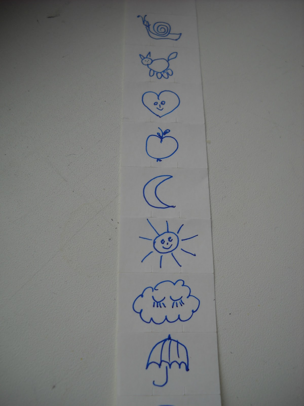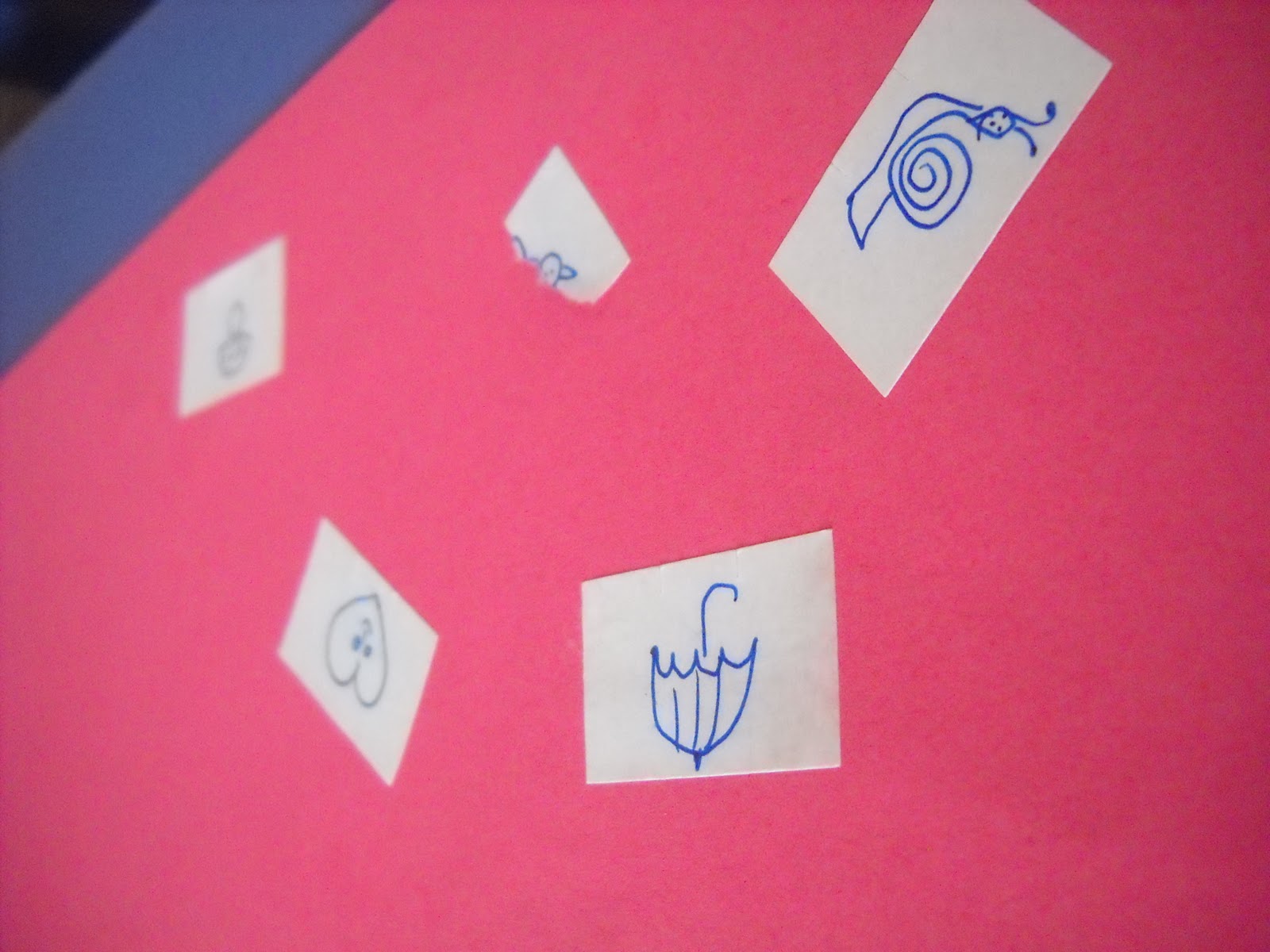 Na małych naklejkach narysowałam zwierzątka , przedmioty… znane Marysi.A Ona je przyklejała na kartkę i nazywała bądź powtarzała po mnie.