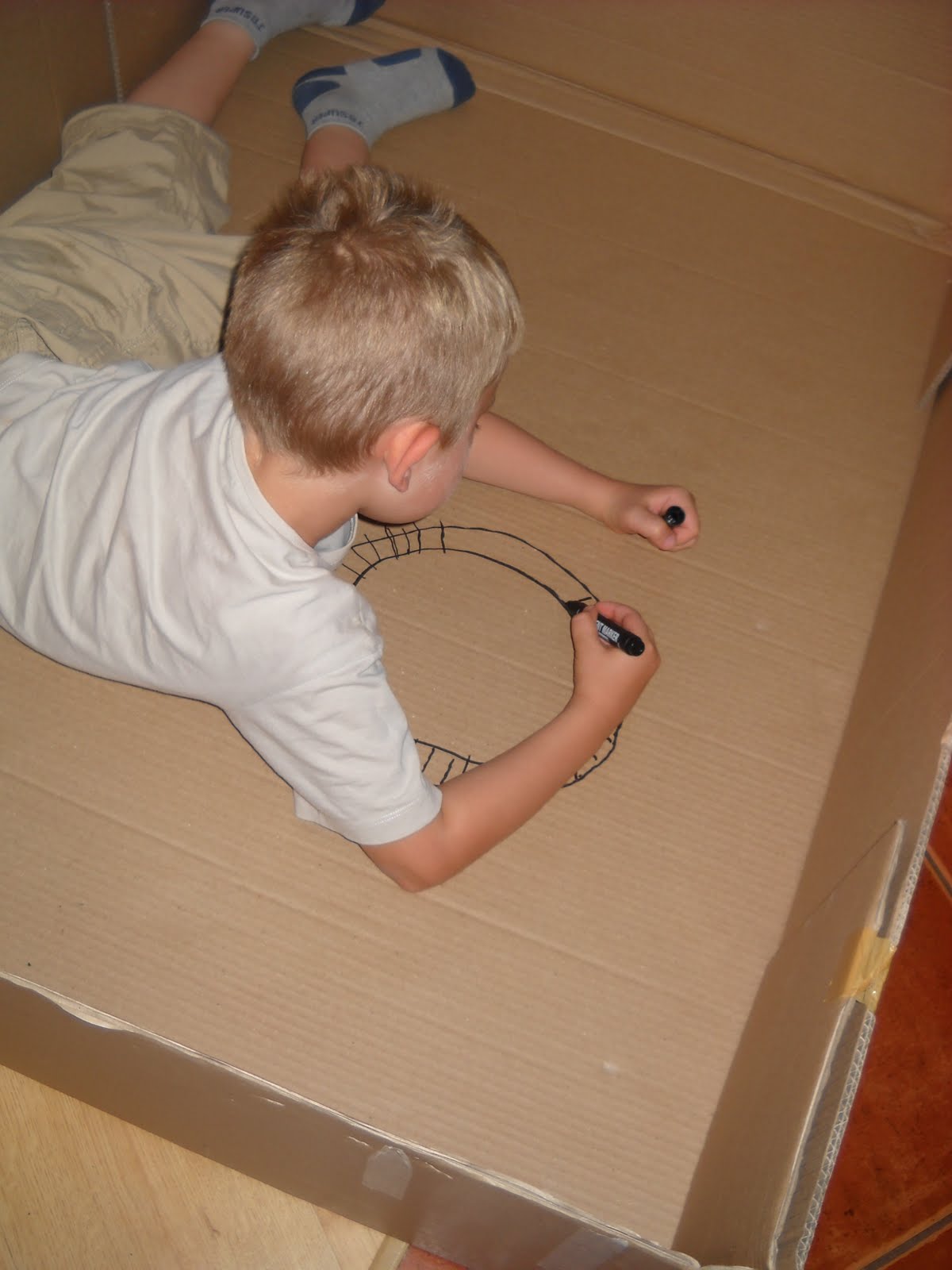 Niebo nam sprzyjało , bo do  sklepiku pod domem przywieziono wielką lodówkę i został po niej wielgachny karton (1,5×1,5), który za pozwoleniem Pani ze sklepu zaadaptowaliśmy na własne potrzeby.